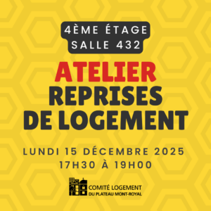 Un atelier sur la reprise de logement aura lieu le 15 décembre 2025 de 17h30 à 19h, au 4450 rue Saint-Hubert, salle 432. L’entrée arrière située au 4449 rue Berri est accessible aux personnes à mobilité réduite.